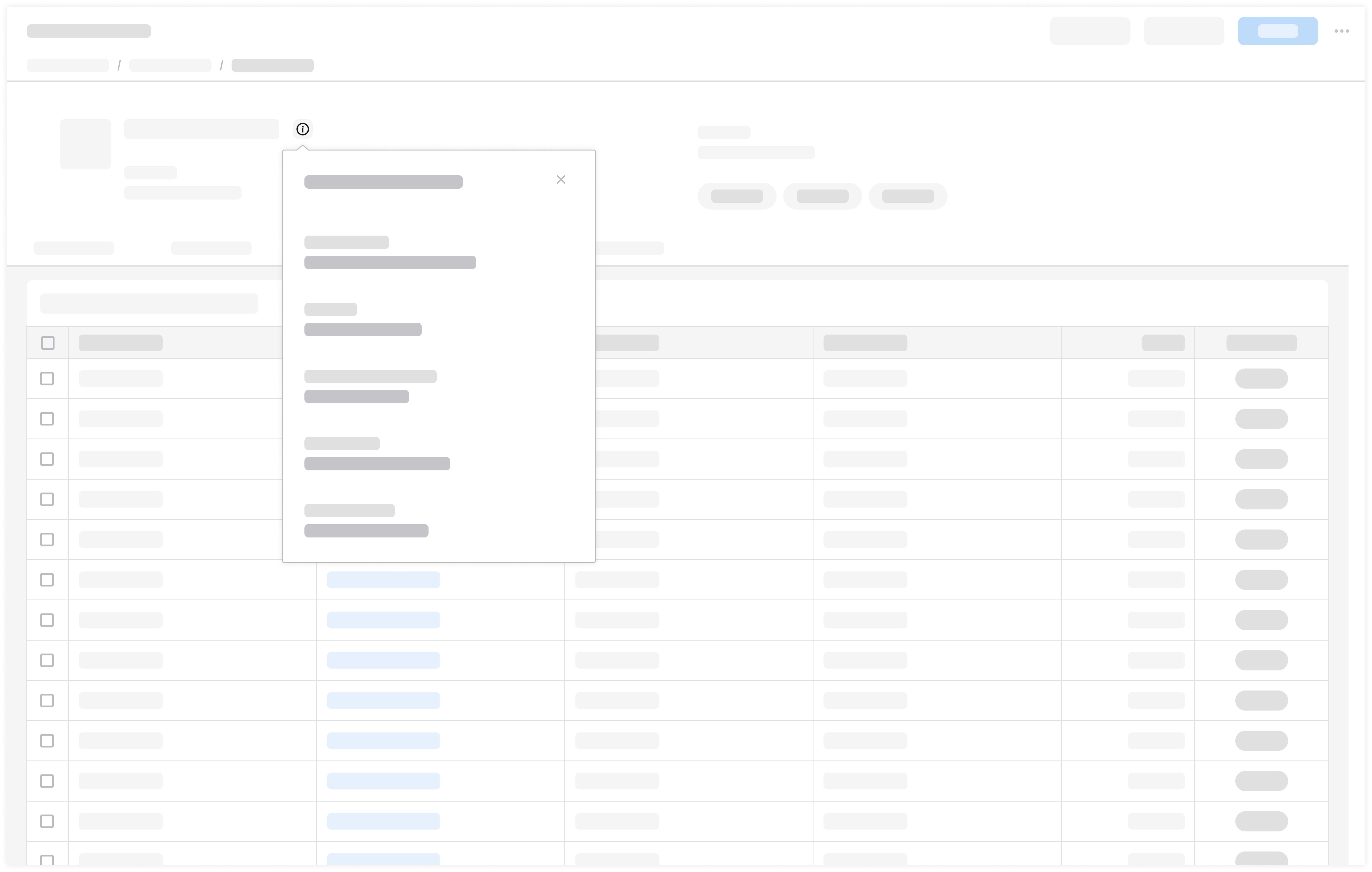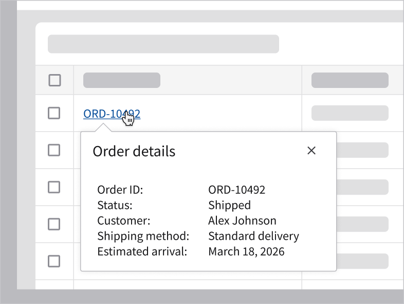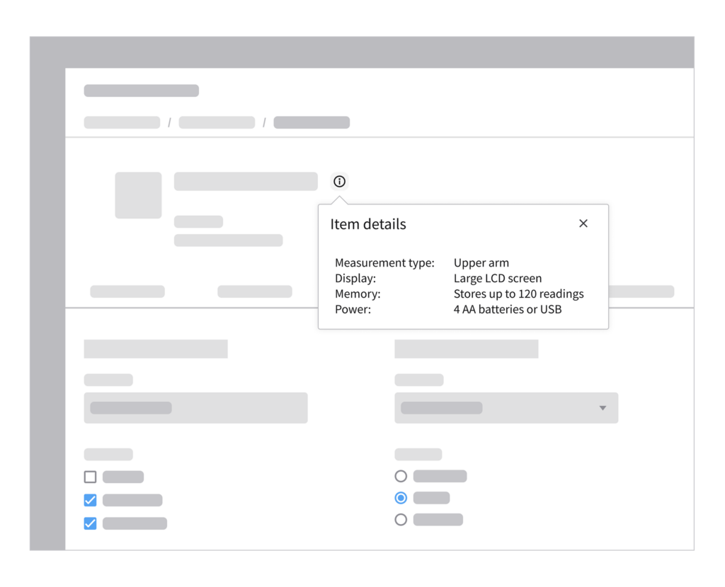 After clicking the information icon, a popup component displays more information about an item. This provides the user with context-specific details without interrupting their workflow.