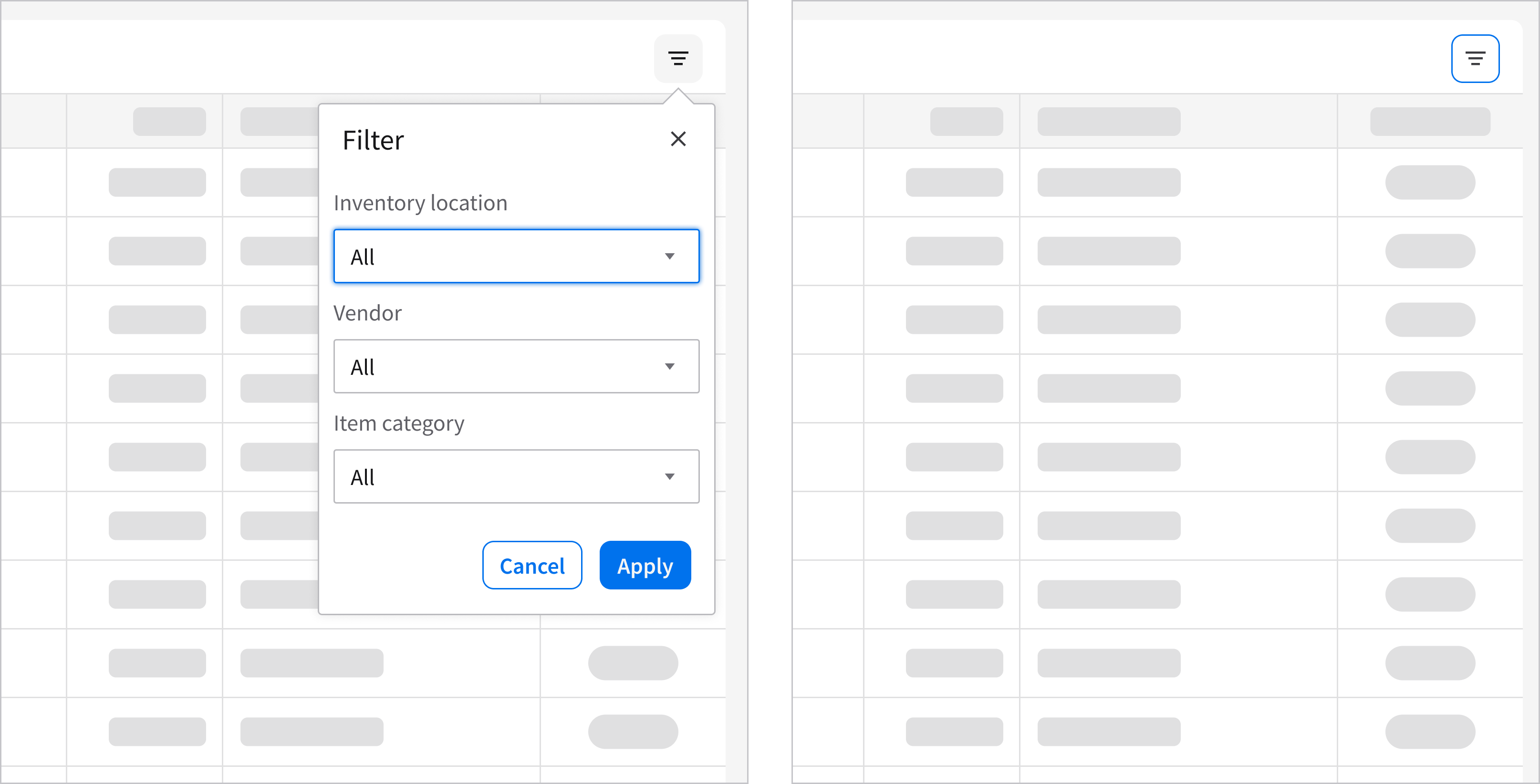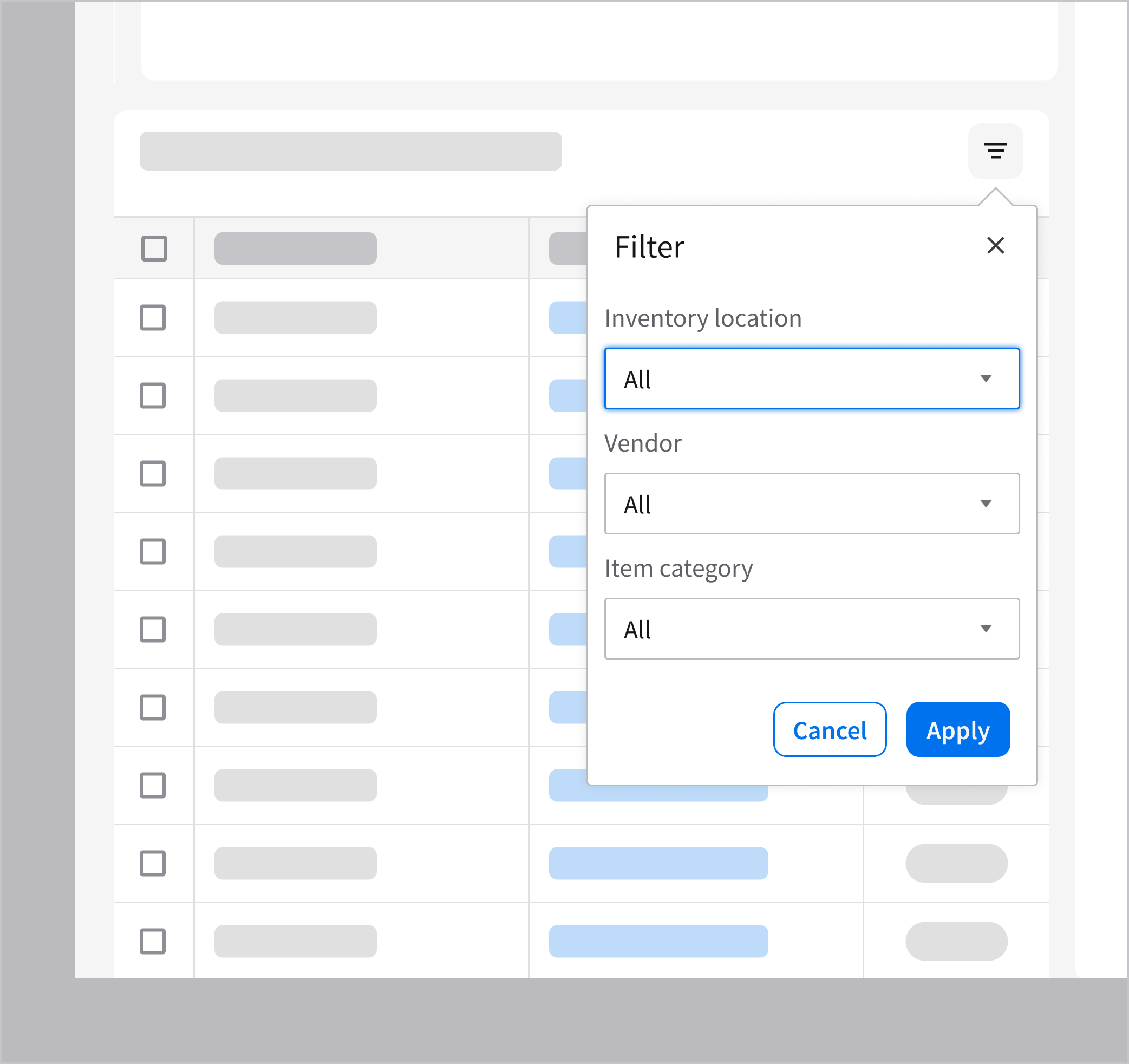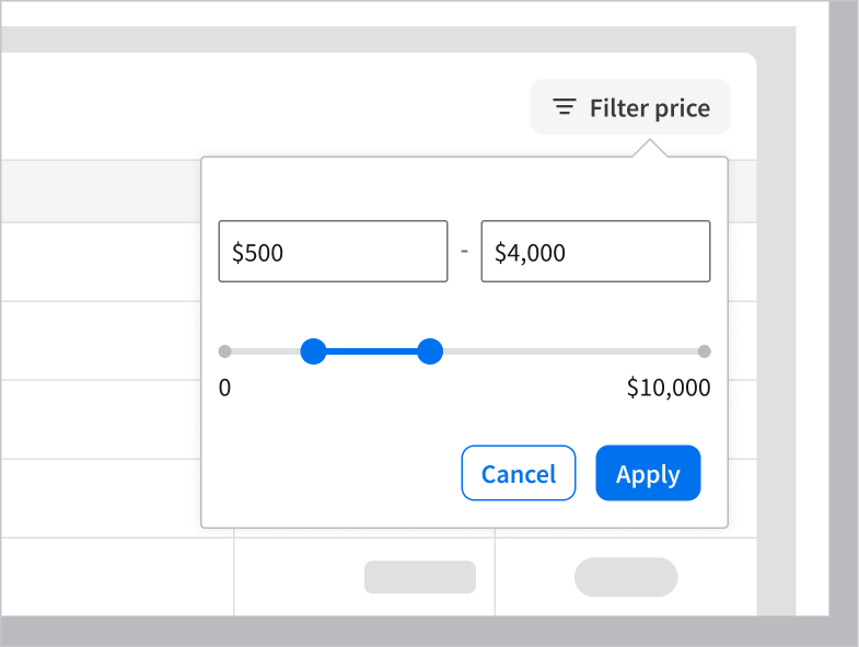 Filtering data grid values is an optional interaction. This allows the user to continue interacting with the underlying content while applying or adjusting filters. This example is using the popup component.