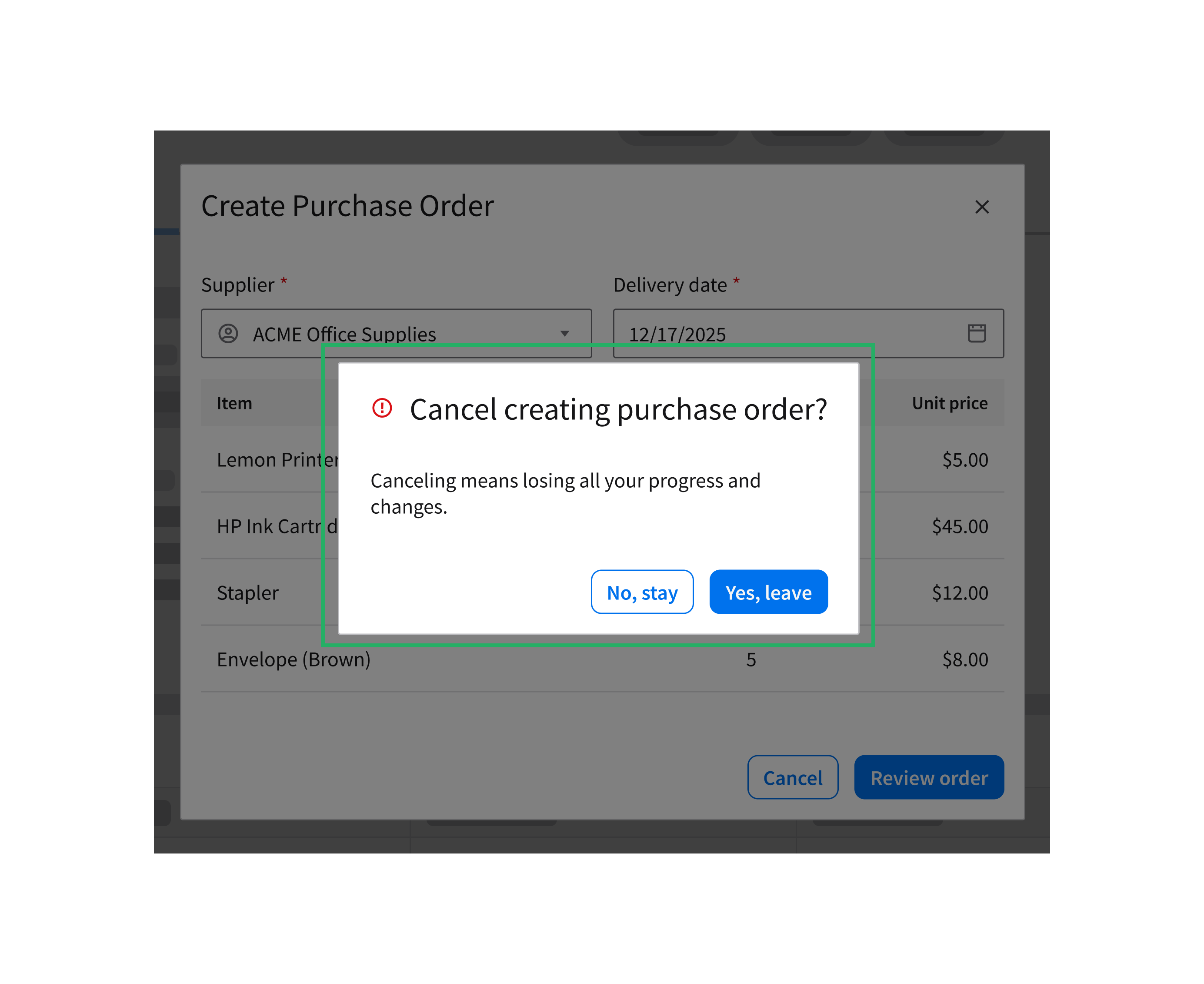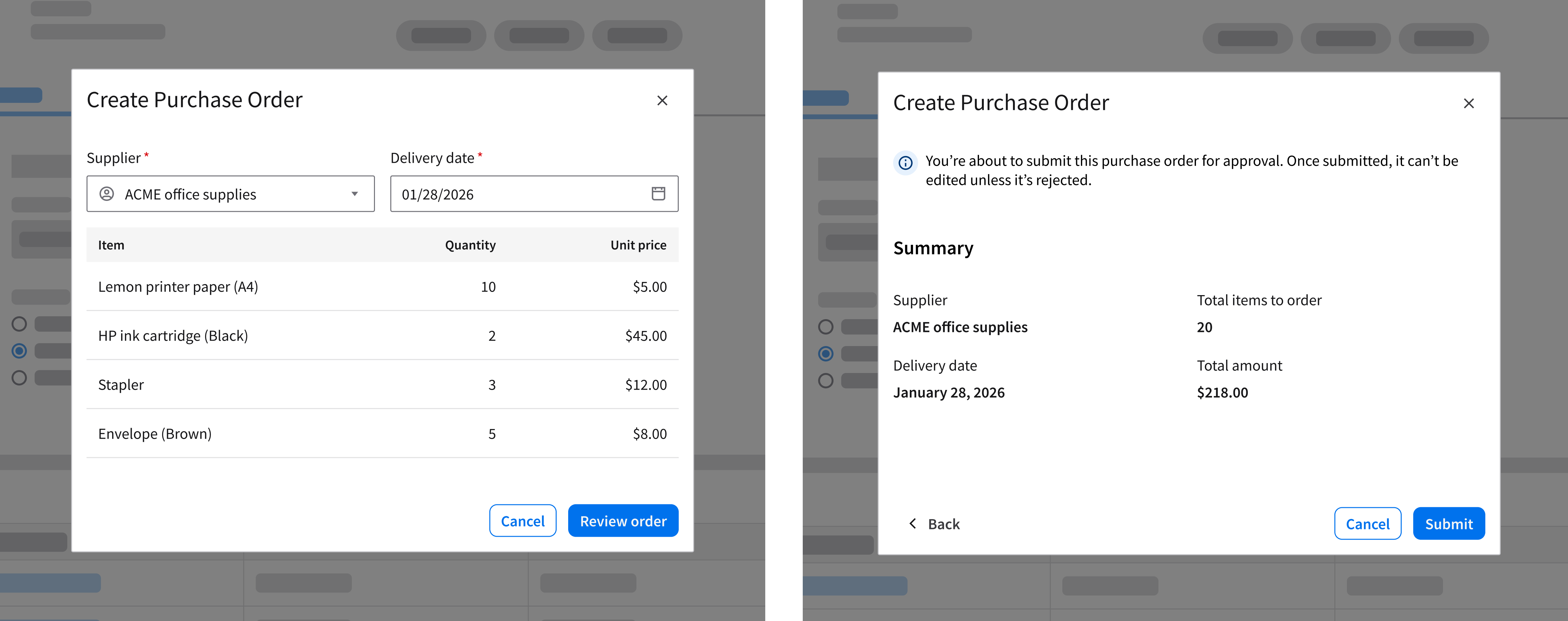 Creating a purchase order requires the user to complete 2 sequential tasks: First, Entering supplier and item details. Second, reviewing the order summary. In second image, note that the 3 buttons have different weights: “Submit” is the primary action button, located on the far right; “Cancel” is the secondary button; and “Back” is a tertiary button.