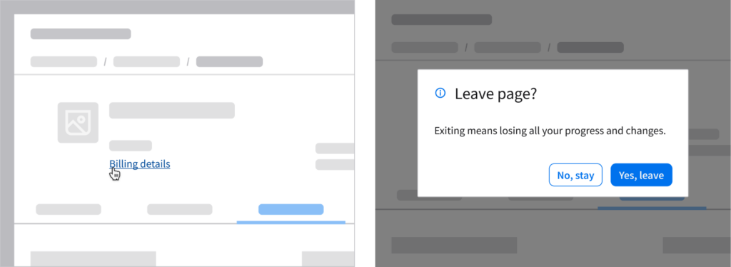 - Avoid hyperlinks that take the user to another page or screen, as this forces them to abandon the task and dismiss the dialog. If supporting hyperlinks are necessary, allow them to open in a new tab or window so the user can return without losing progress.