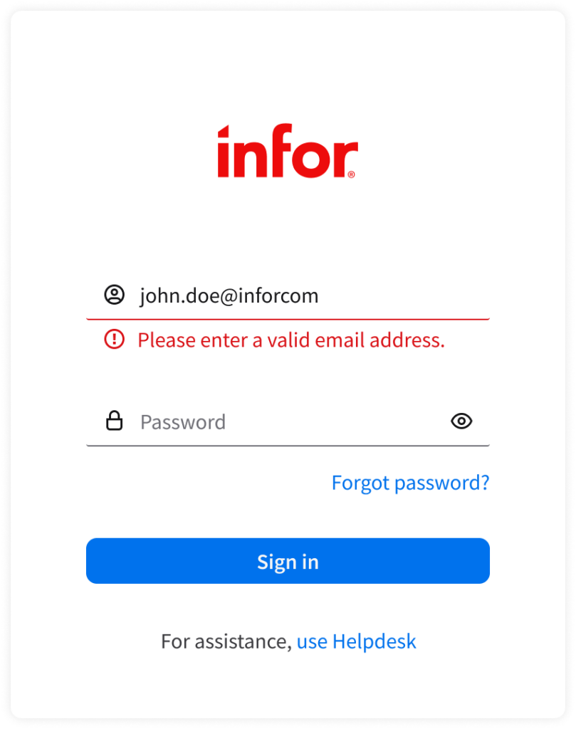 - For input that doesn’t meet specific field criteria (such as an invalid email format), display actionable help text (field-level errors) below the relevant field. Help text appears only after the user navigates away from the field.